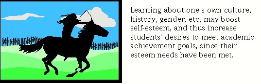 Consider effects on student self-esteem as well as achievement. If students learn in school that no one of their gender or race ever did anything worth studying, they may eventually decide they don't want to learn any more history or science or even come to your school any more. If they have to sacrifice their self-esteem for achievement in your schools, maybe it's just not worth it to them. Ask yourself, really, why should they have to make that trade-off? Was everything ever done worth learning about REALLY done by dead, white men? If a student continually fails, he or she may conclude that it is better not to try. Yes, the child won't achieve, but he/she's not achieving anyway, and why try and just let people think you are stupid? I would recommend that every classroom should have a mix of experiences so that every child experiences SOME successes. Every child is good at something. There will be failures, too, and that is okay. Overcoming your failures, and achieving something you weren't always able to do gives a sense of achievement and also boost self-esteem. People need a mix of success and failure experiences. (Starting to sound like Erikson, isn't it?) |