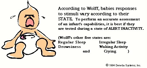You are gross, just gross! You are SO-O-O gross! I don't understand why everybody says that babies are so cute and sweet. You're not sweet. You wake Mom up in the middle of the night and then she sleeps late in the morning and everyone else gets late to school. And you are always hungry. You are such a pig; you are just eating all of the time. And you SMELL! You smell disgusting. You poop and pee and spit up. You get every kind of bodily fluid on everything. You spit up on me and on my shirt and on the car seat and the blanket. You peed on the changing table and on mom's hand and leaked all over your clothes. Actually, while you may think Ronda is being inordinately harsh in her description of her baby sister, and perhaps well on her way to causing lasting damage to the baby's self-esteem, she has hit on some very appropriate points. First of all, there is the description of what babies do. Wolff identified six states of infants: Notice that four of these states are similar to those mentioned by Ronda - crying, two types of sleep and almost asleep. While this use of time strikes an eleven-year-old as extremely boring, it is necessary for a couple of reasons. First, all that growing takes a lot of energy, and, consequently, wears a body out. Second, babies are exposed to new stimuli constantly. My husband commented that being a newborn must be like being constantly high. (Having attended the University of California in the early seventies, he had the opportunity to witness many people in such a state!) It is true that newborns are constantly being bombarded with new sights, sounds, smells, tastes and textures that they have never experienced before. The world is a completely different experience to infants than it is to us. Adults ignore much of the stimuli around them, because they have learned what to "tune out". For example, you may be sitting in a computer lab at this very minute. Without looking, can you answer the following questions: a) you have learned that those pieces of information are unimportant, or b) you have experienced the same event so many times, such as walking into this room, that you pay absolutely no attention to the details - you do it automatically. According to Brazelton, infants' defense against this rush of stimuli is to sleep - and sleep infants do - sixteen hours a day and more. Unfortunately, these sixteen hours do not come in one lump, but are broken up into many naps, interspersed with periods of wakefulness. In our house, the longest one of those periods comes between midnight and 4 a.m. most nights! One reason knowledge of infant states is important is to understand the behavior of normal infants, and to be able to communicate to parents what kind of behavior to expect.